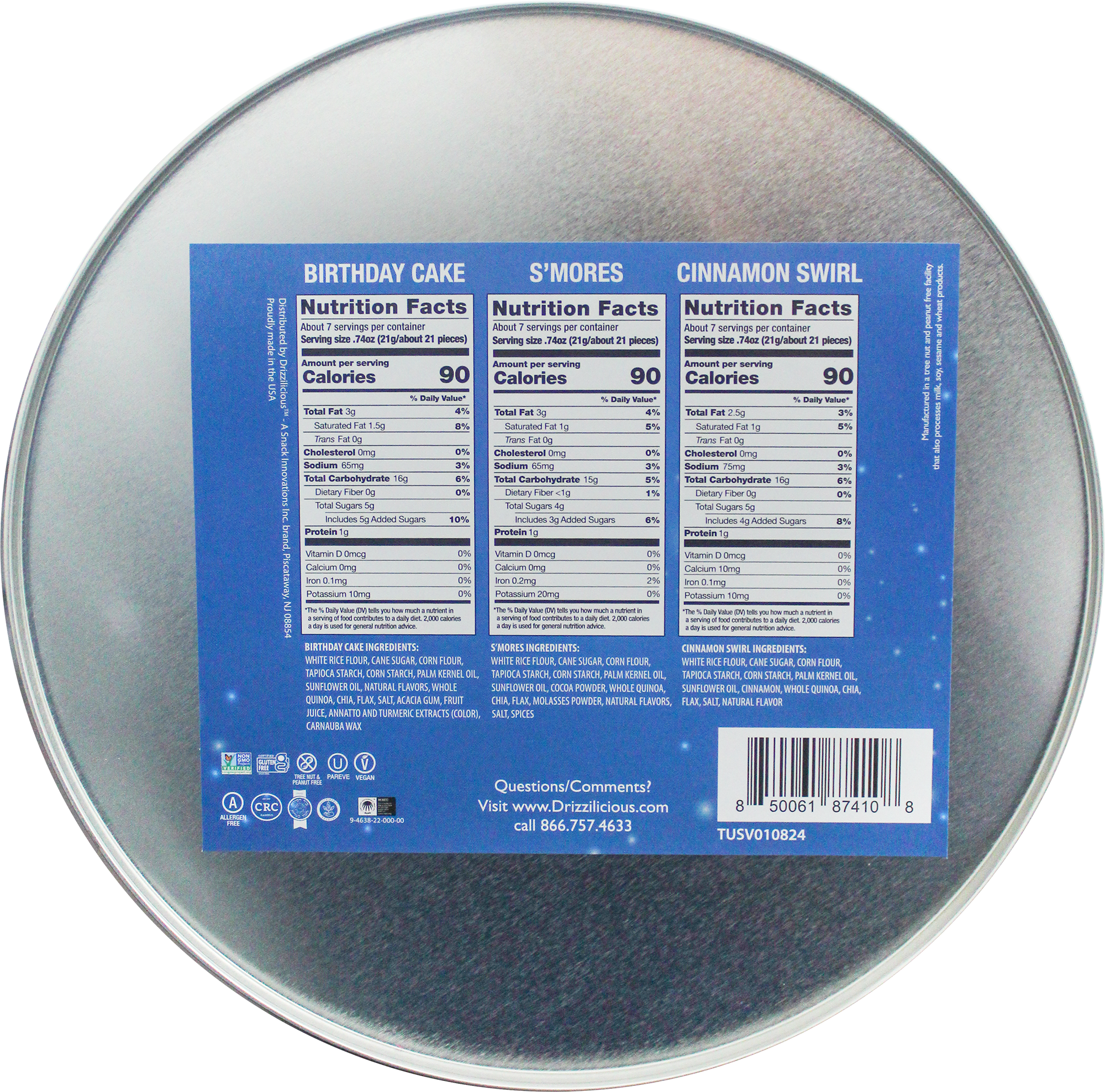 Each holiday tin contains 3 5.5oz bags. 1 Cinnamon Swirl. 1 Birthday Cake. and 1 S’mores.